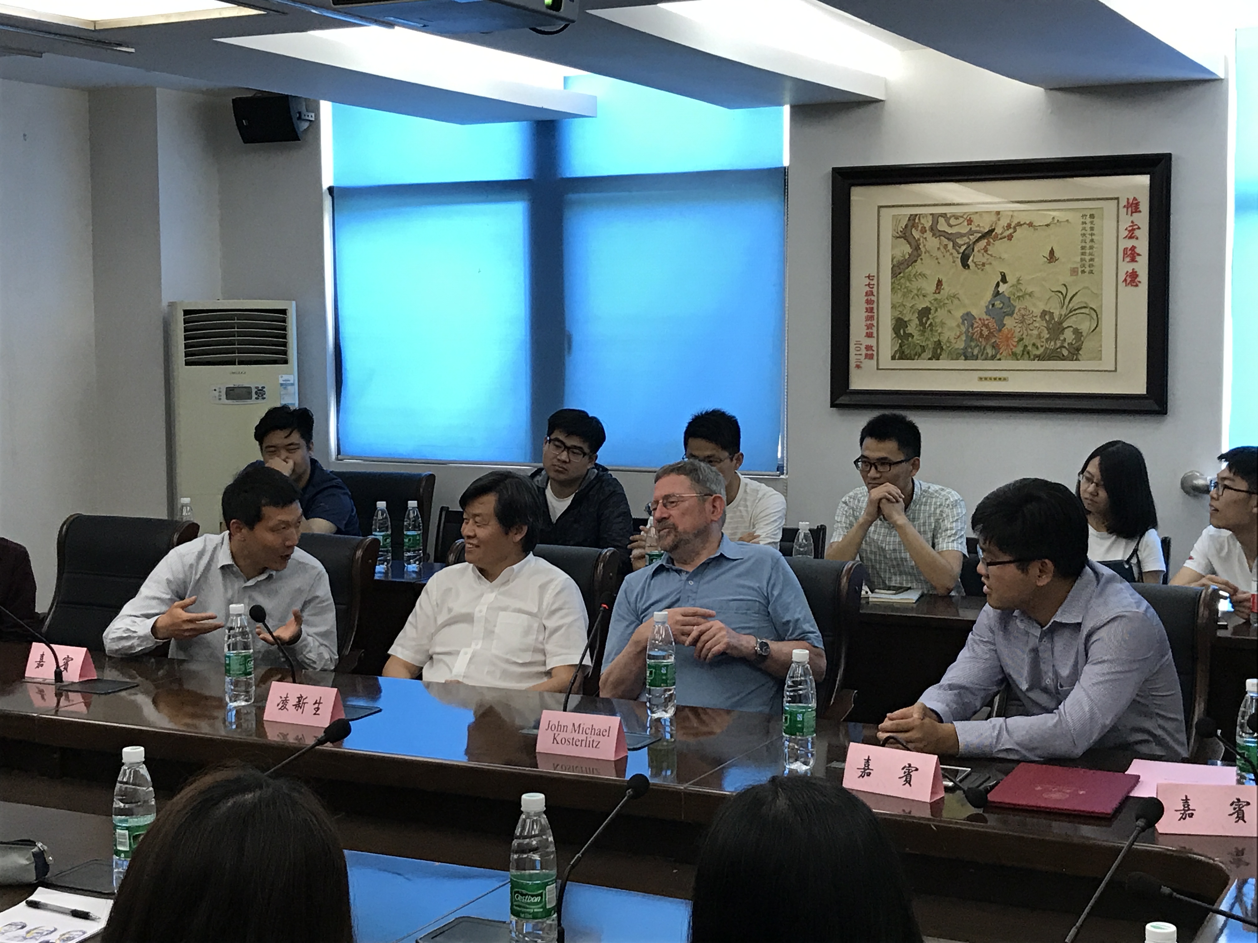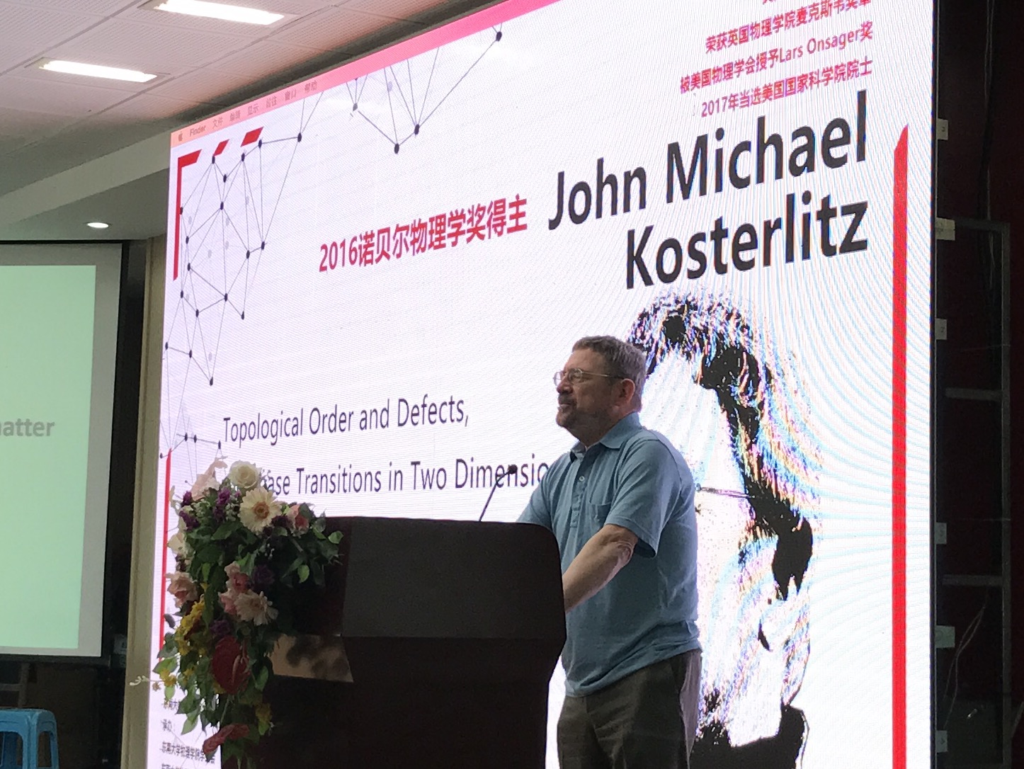 5月24日上午9点30分活动于九龙湖校区J3105报告厅正式开始,活动的第一环节首先由主持人介绍到场嘉宾,其中包括365英国上市网站官网副院长倪振华教授,365英国上市网站官网董帅教授,机械工程学院凌新生教授等。其次主持人为现场听众介绍了Kosterlitz教授的主要个人履历以及他研究生涯中所获奖项,令现场听众深刻地感受到了Kosterlitz教授的科研之路的充实与辉煌。活动的第二环节主要由教授为全校各系师生作了一场主题“Topological Order and Defects ,and phase Transitions in Two Dimensions”的报告,报告主要围绕其研究生涯展开,具体讲述了科研历程中的重要节点以及成功的关键因素,充分展现了诺贝尔奖得主的个人魅力。
