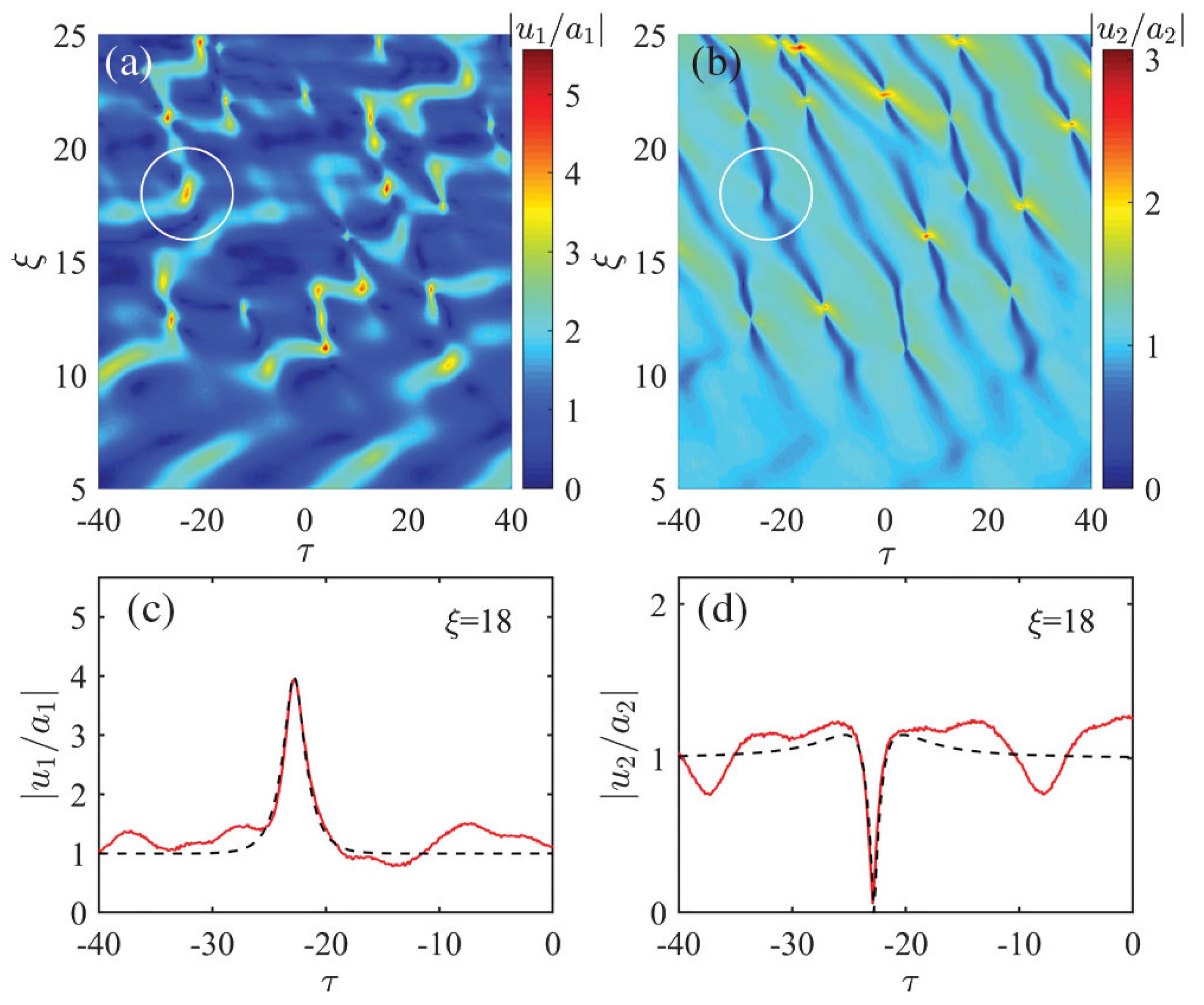 作为rogue waves原型,Peregrine孤子吸引了广泛的研究兴趣,其原创理论及实验研究结果多发表在Nature、Nature Physics、PRL,PRX等这类顶级期刊上。在本工作中,作者借助解析推导首次报导了一类反常Peregrine孤子(其峰振幅可以超过背景高度的三倍以上),深入分析了其产生机制,演示了其数值稳定性及噪声背景下的数值激发,见下图。这项工作有助于阐释复杂多分量非线性系统的超级rogue waves现象。
