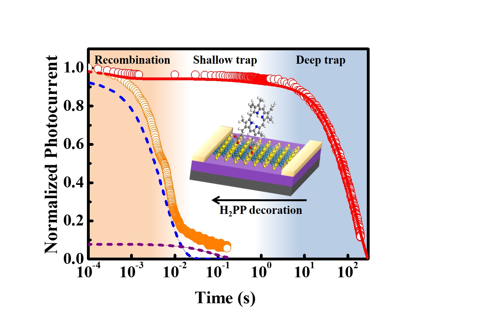 在本工作中,倪振华教授和王金兰教授课题组分别从实验和计算模拟入手,以二硫化铼(ReS2)为例,提出利用缺陷工程控制二维光电导器件中载流子的束缚态。研究结果显示,原卟啉(H2PP)分子中的氧原子会在ReS2的硫空位处与周围的铼原子成键,并起到调控能带结构和缺陷能级的作用。相对于原始样品中深能级束缚态所主导的光电响应,改性后器件的光响应由浅能级束缚态以及复合中心所主导,响应速度提高了3-4个量级(图二)。此外,H2PP分子与ReS2之间存在较强的电荷转移,可以抽取ReS2中的富余电子,进而大幅降低器件的暗电流和噪声,使得改性后器件的光探测率达到了1.89x10^13 Jones。本工作提供了一种通过缺陷工程调控半导体中光致载流子束缚态的研究思路,有利于同时实现光探测器中高灵敏度和快速响应这两个关键指标。