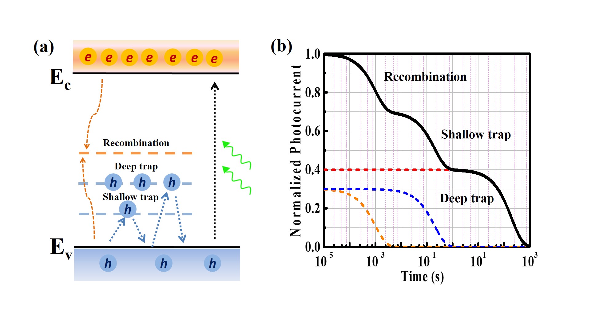 图一。n型半导体中光生载流子的激发、复合和束缚过程(含深能级和浅能级束缚态)(a),以及这些过程所对应的器件响应时间示意图(b)。