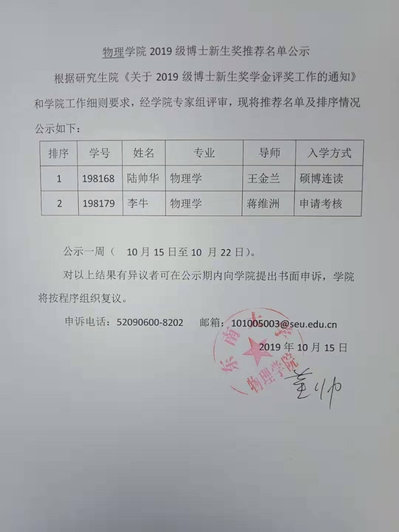 365英国上市网站官网2019级博士新生奖推荐名单公示