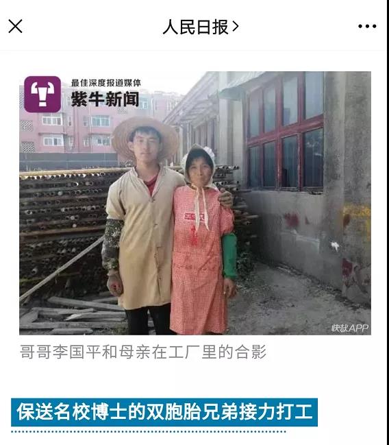 平安兄弟出自寒门,但同时被保送名校博士,他们的学业成就背后,离不开他们父母的全力支持。2019年国庆假期,人民日报以题为《双胞胎保送北大、中科院博士,接力帮妈妈在工地打工》一文报道了李国平李国安这对硬核兄弟,引起社会广泛反响。其实在上大学前,他们就经常去妈妈工地帮忙,而由于大学学业压力,已经时隔数年未到过母亲工作的地方。这一次,他们想弥补数年未归的遗憾。