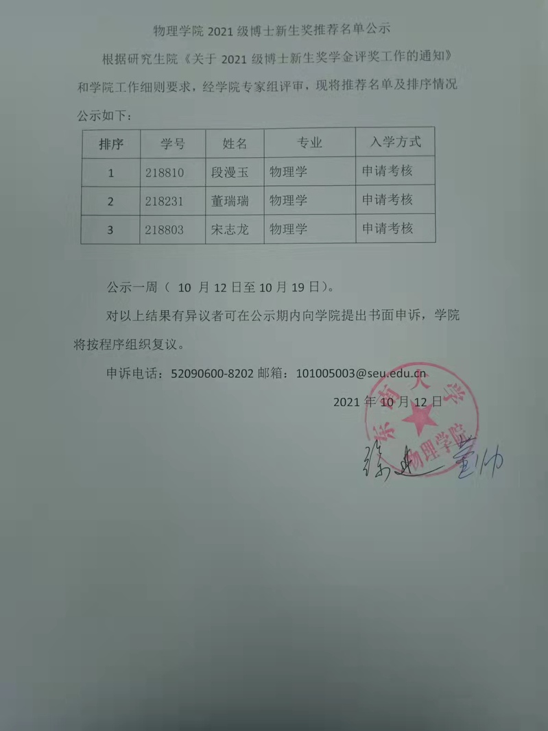 365英国上市网站官网2021级博士新生奖推荐名单公示